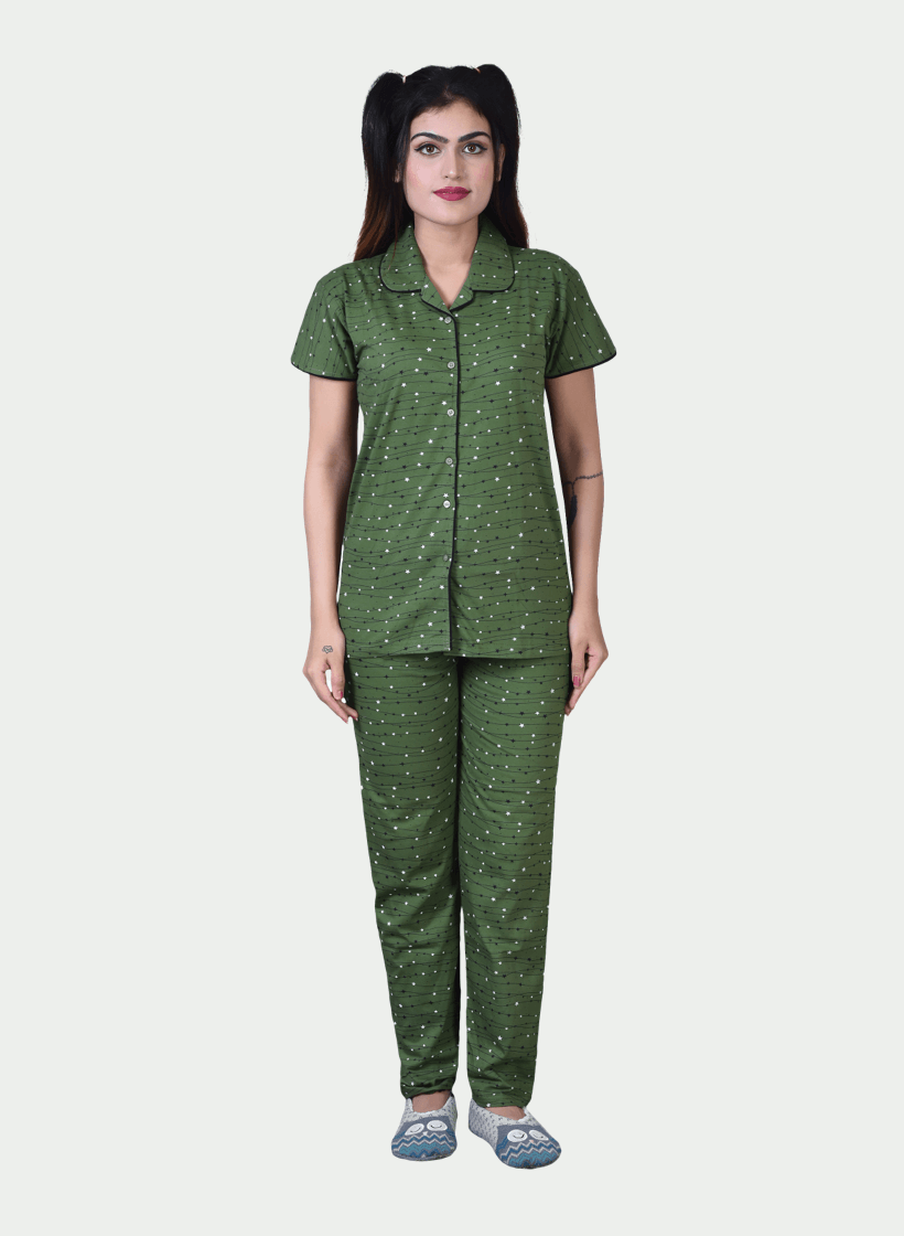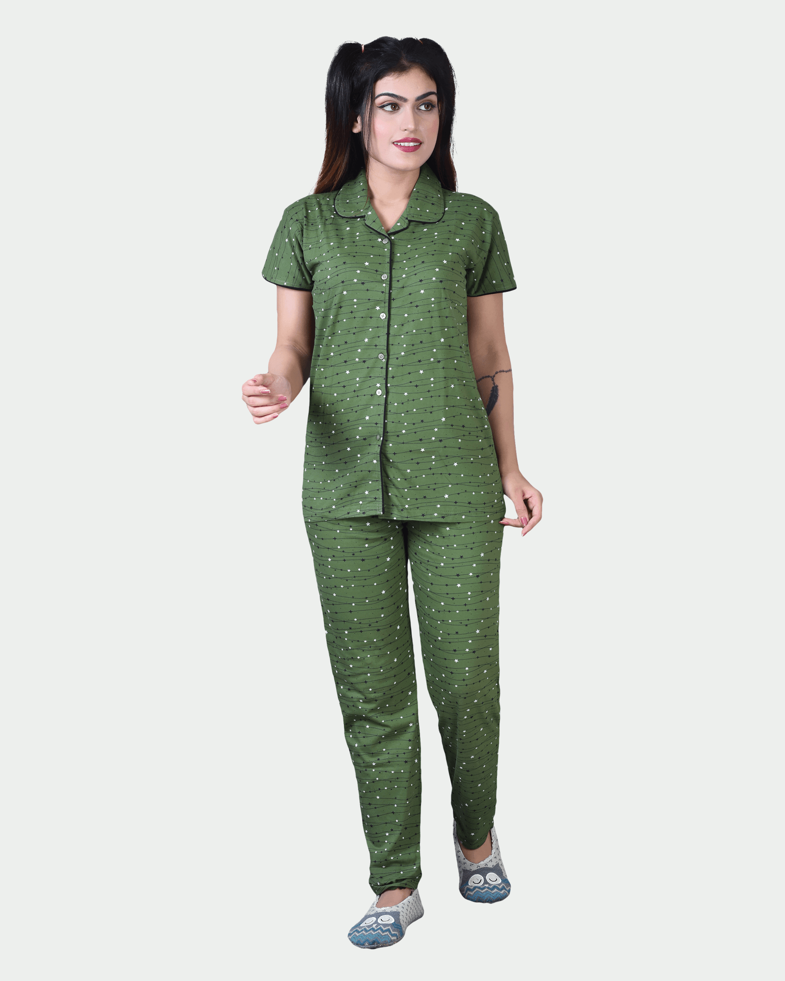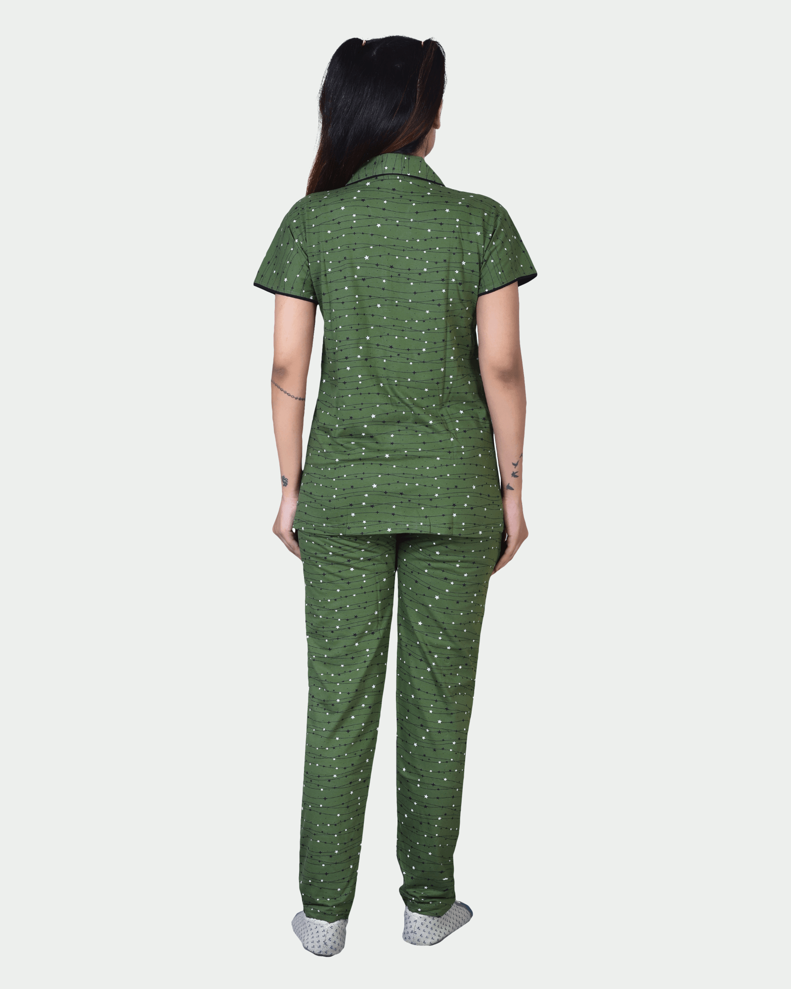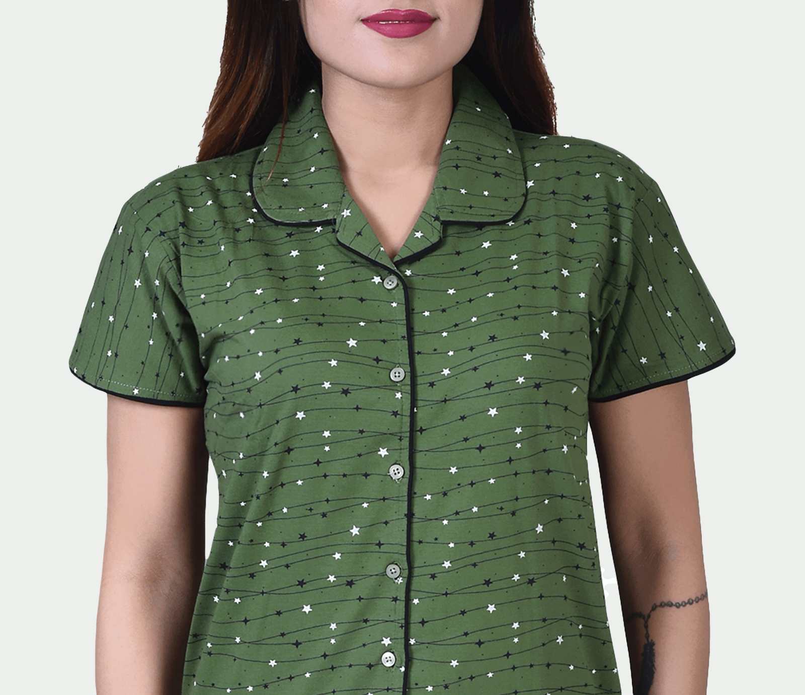 Bottle Green front open cotton PJ set with overall print consists of shirt and pajama. The printed shirt has a lapel collar, short sleeves and contrast piping. A pair of similar printed slip-on pyjamas have an elasticated waistband with one pocket. It is the perfect luxury cotton PJ set for indoors/outdoors.