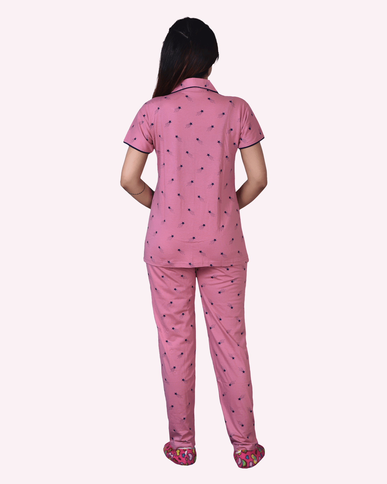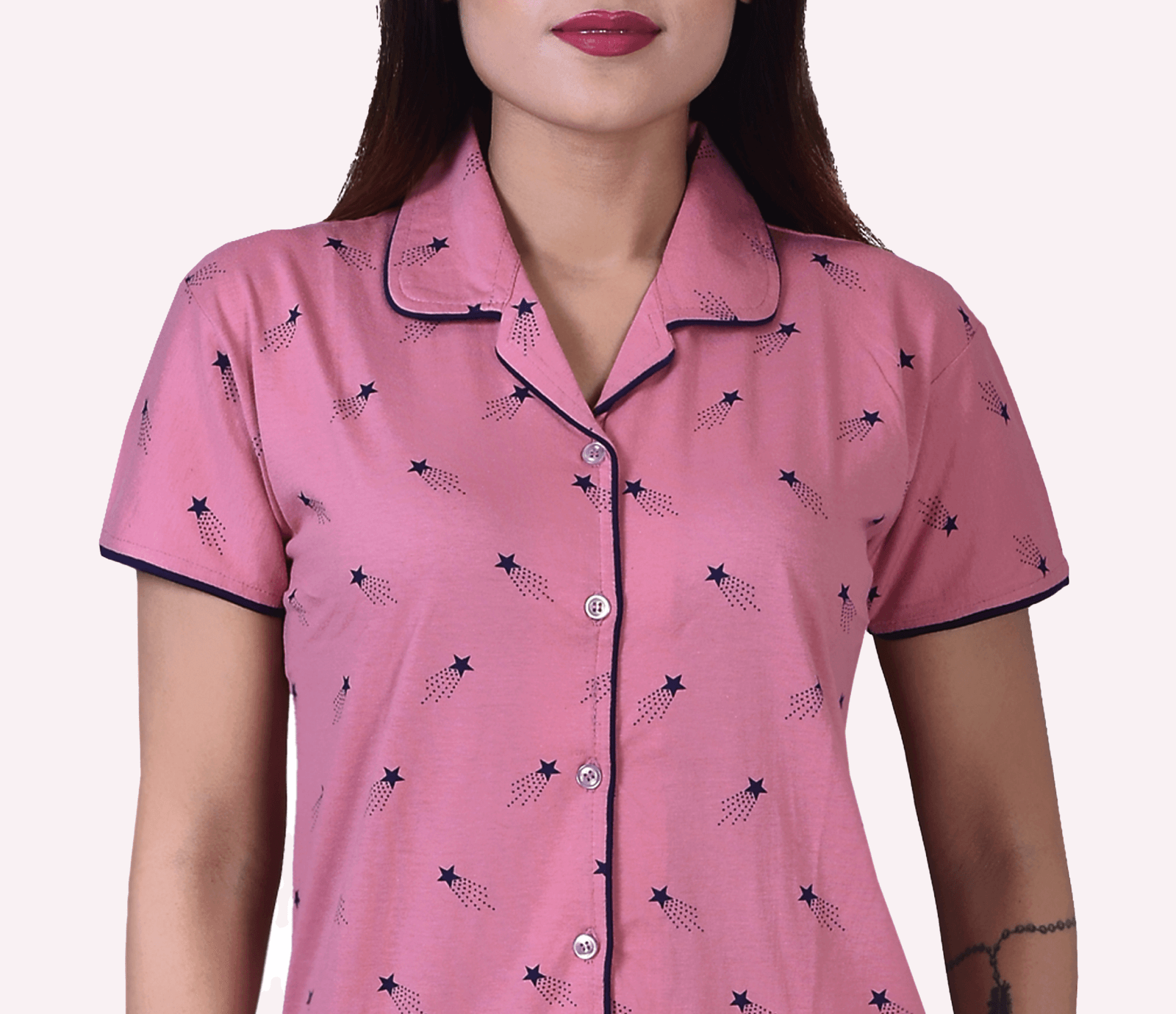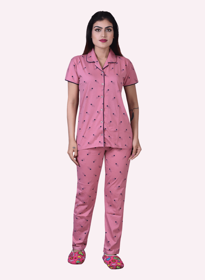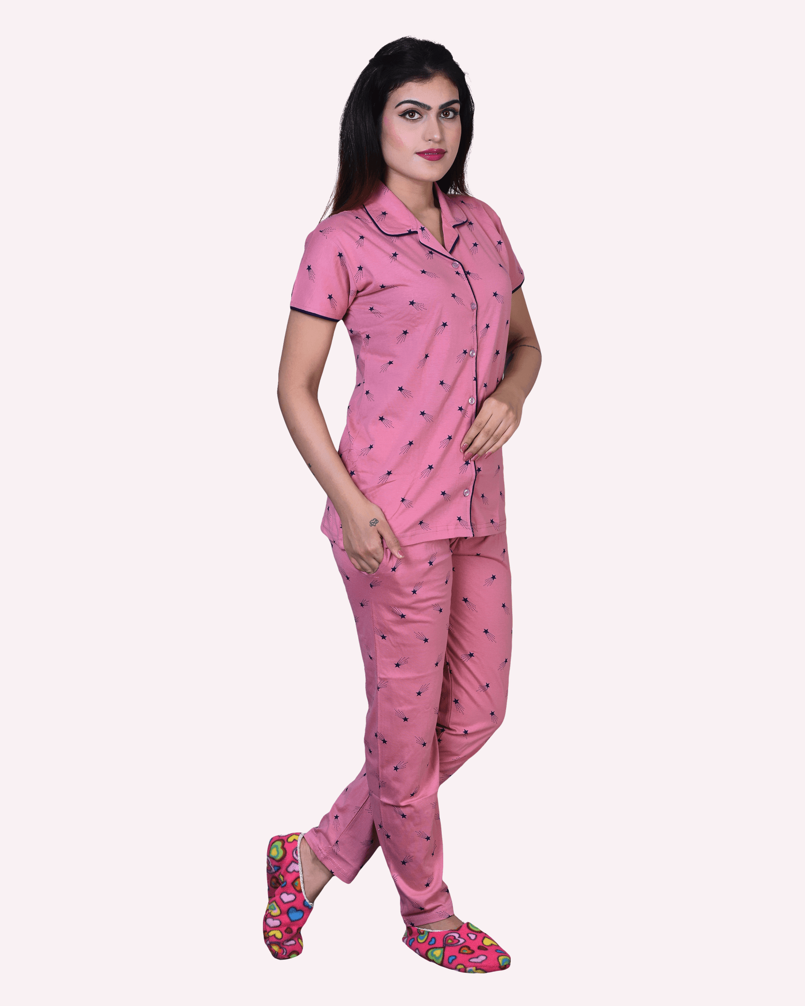 Pink front open cotton PJ set with overall print consists of shirt and pajama. The printed shirt has a lapel collar, short sleeves and contrast piping. A pair of similar printed slip-on pyjamas have an elasticated waistband with one pocket. It is the perfect luxury cotton PJ set for indoors/outdoors.
