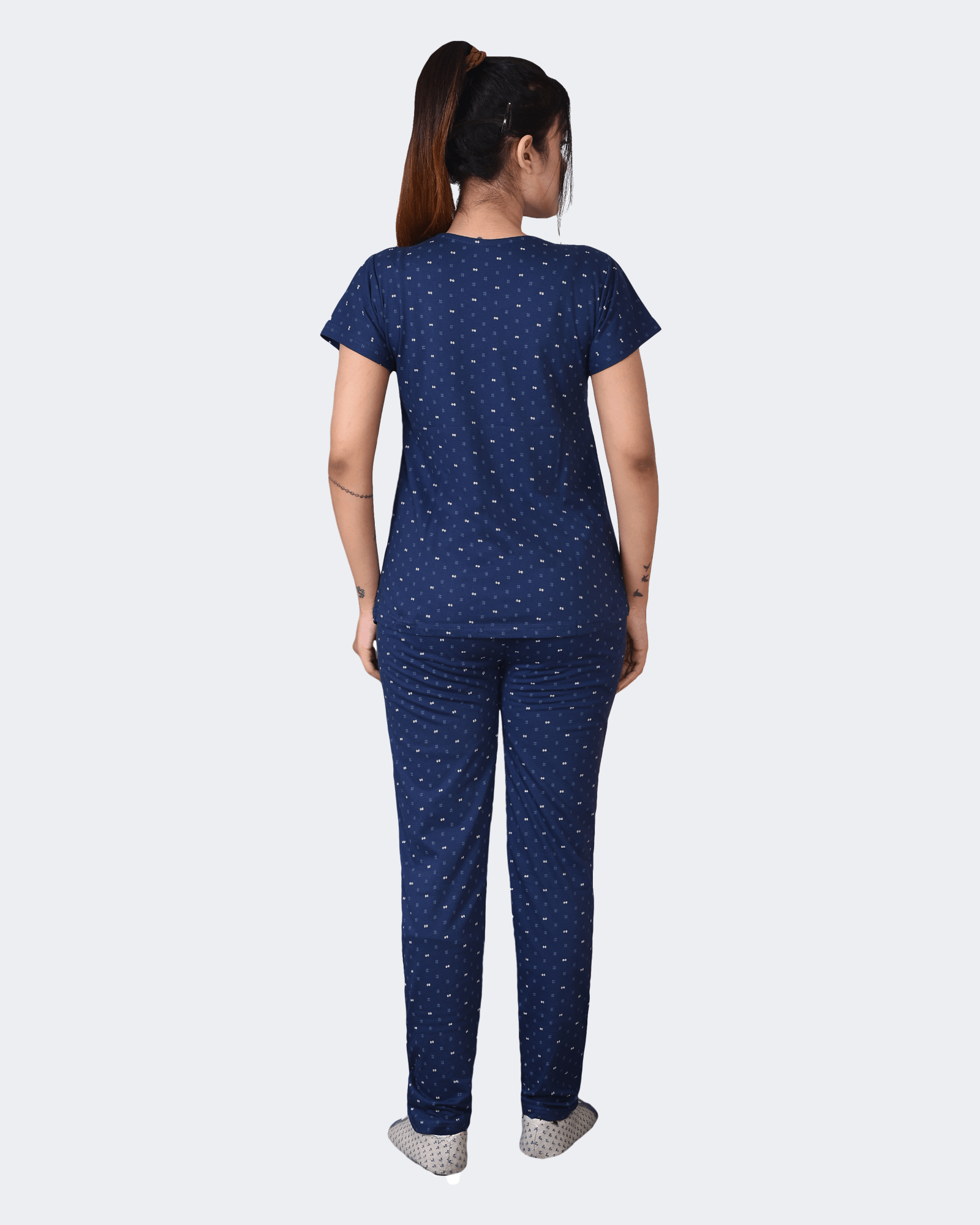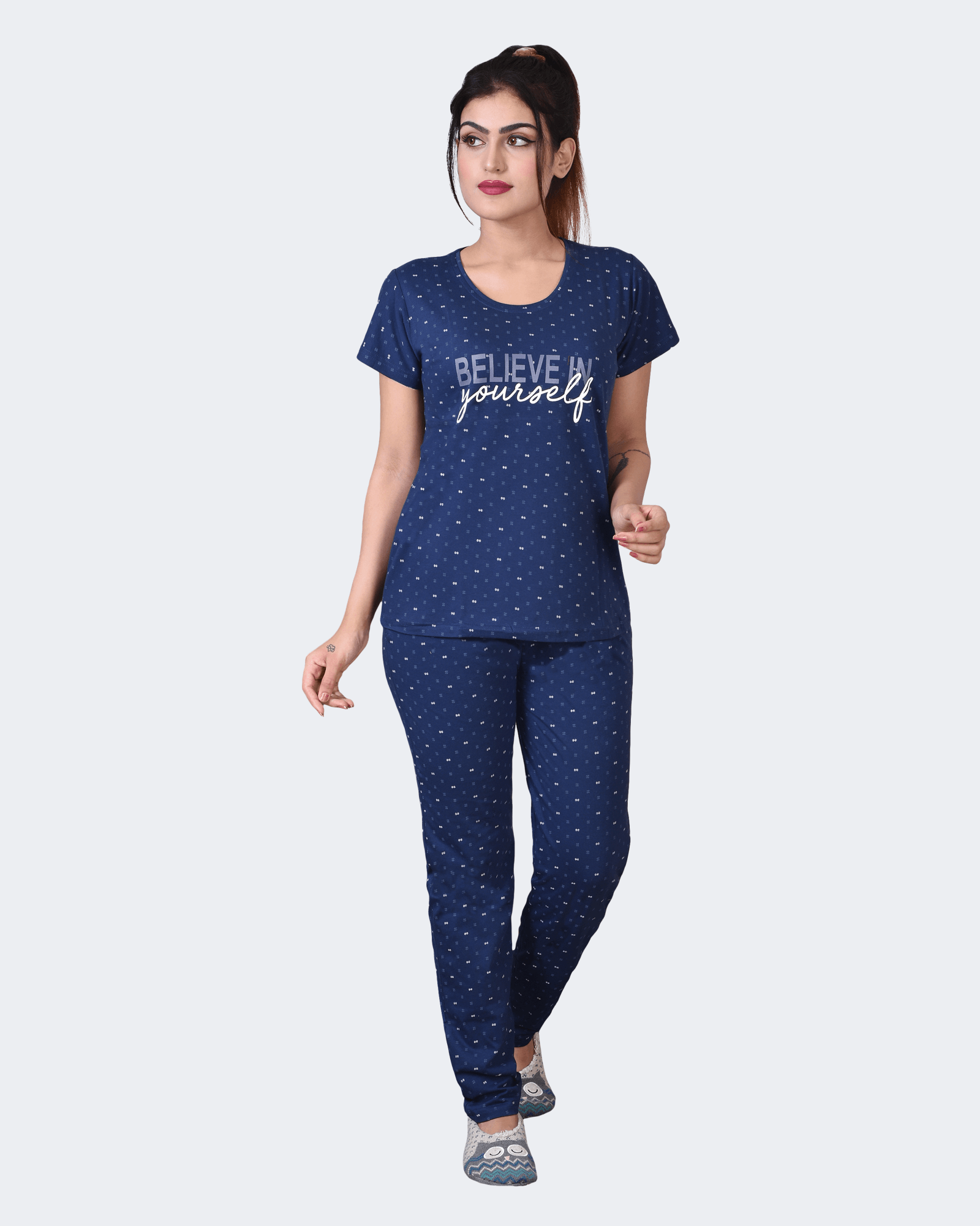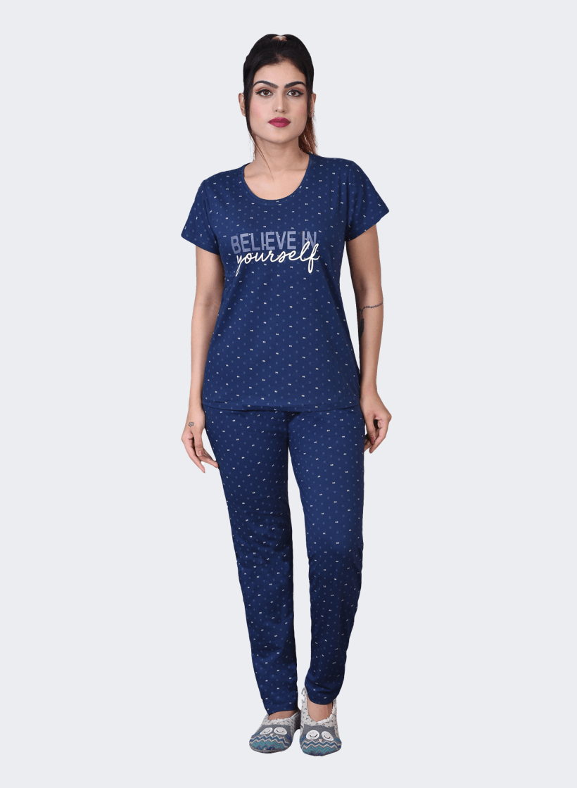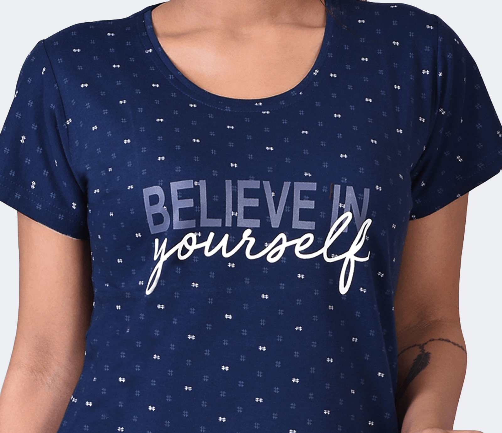 'Believe in Yourself' is a premium Pajama set that consists of a blue top and pajama with overall print. The blue color top has a round neck, short sleeves and a printed quote to make you look amazing with all-over print.
