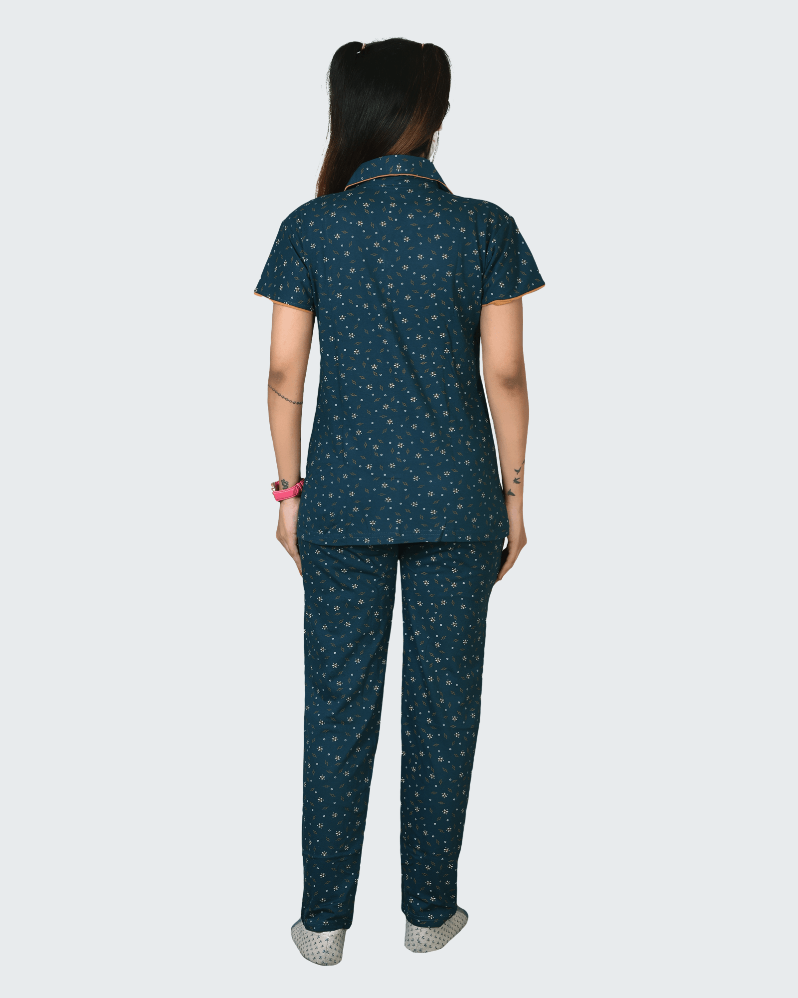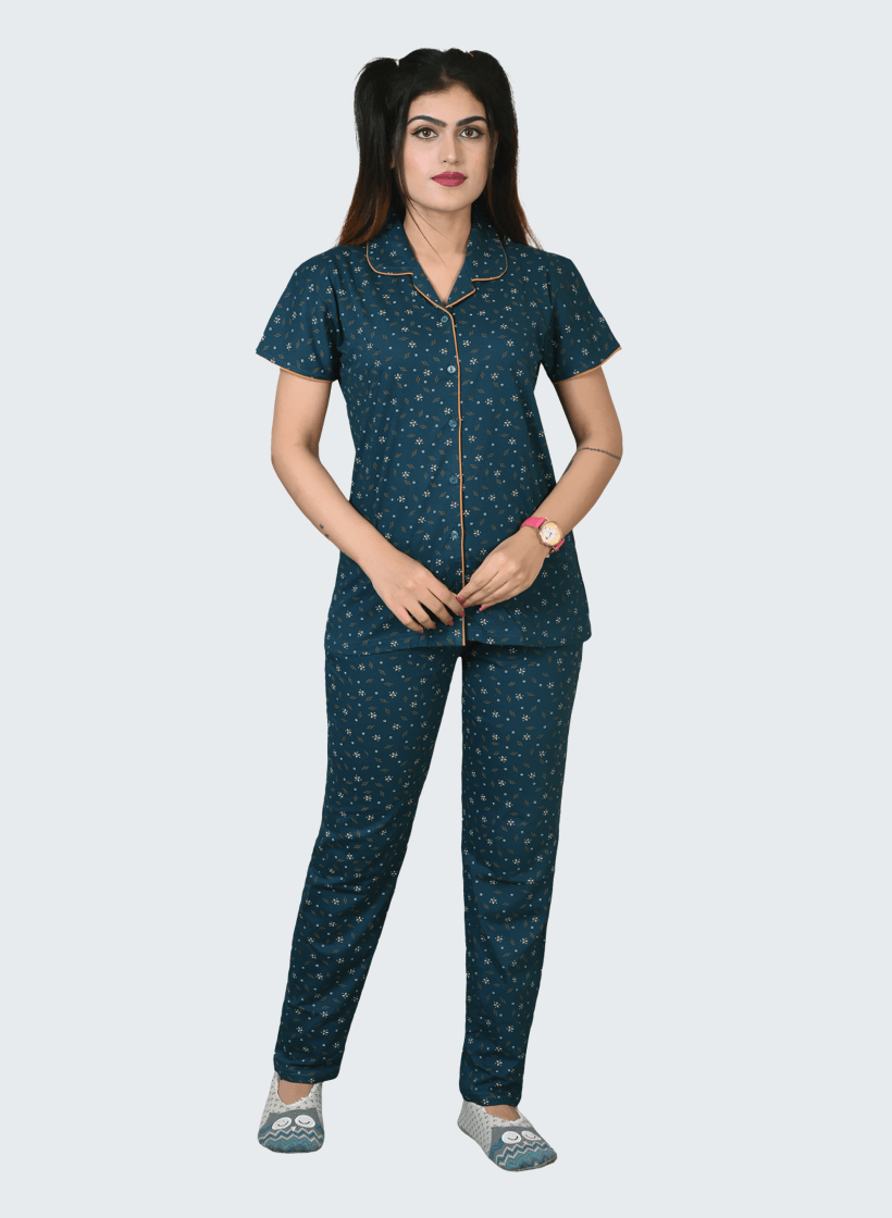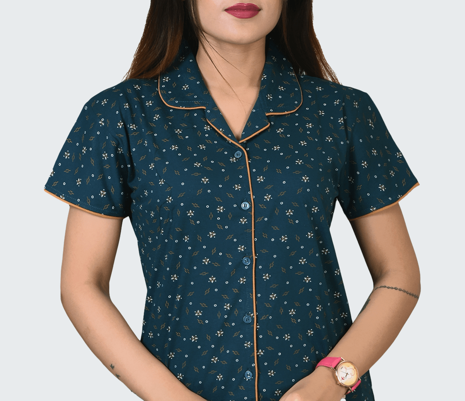 Blue front open cotton PJ set with overall print consists of shirt and pajama. The printed shirt has a lapel collar, short sleeves and contrast piping. A pair of similar printed slip-on pyjamas have an elasticated waistband with one pocket. It is the perfect luxury cotton PJ set for indoors/outdoors.