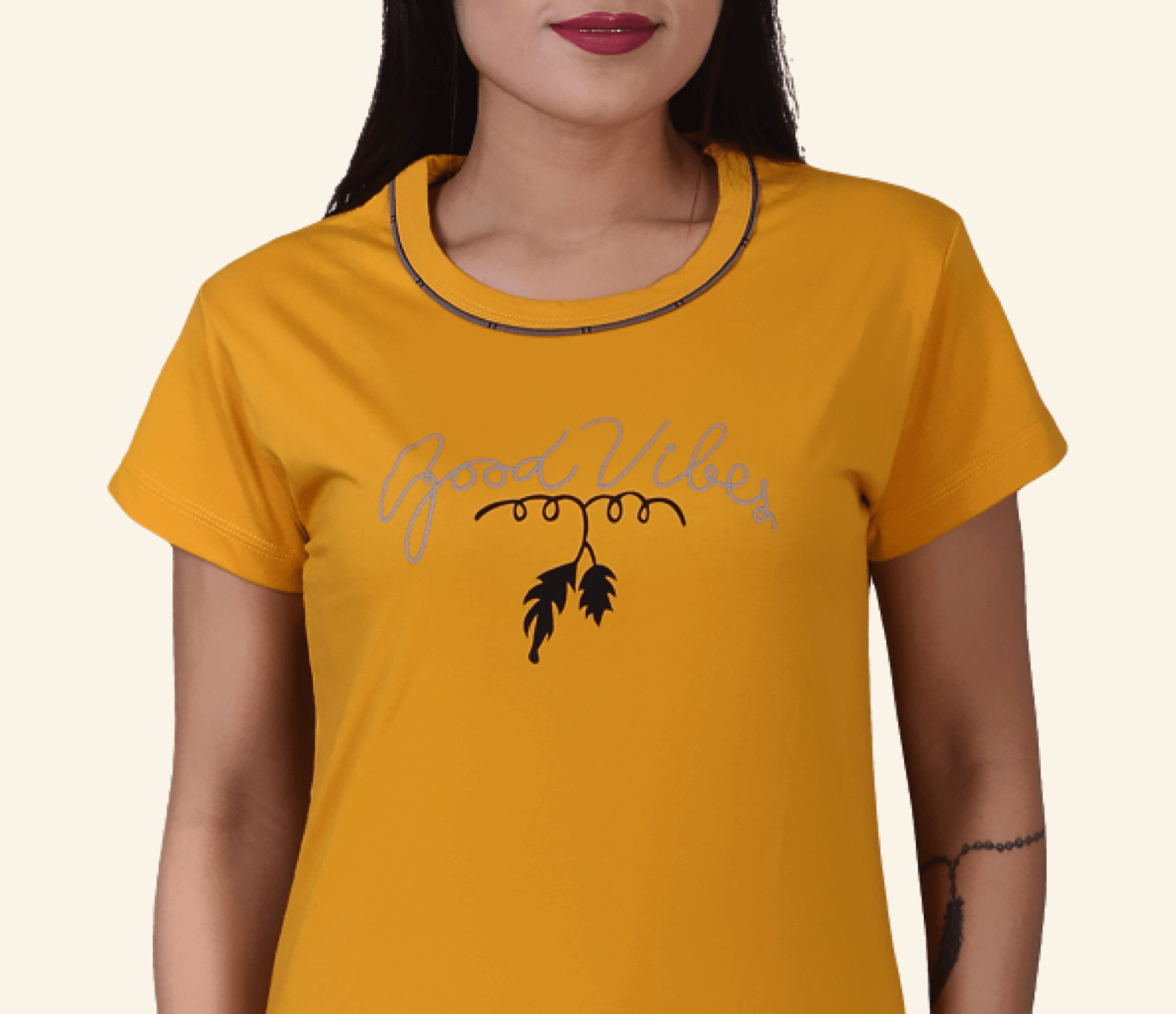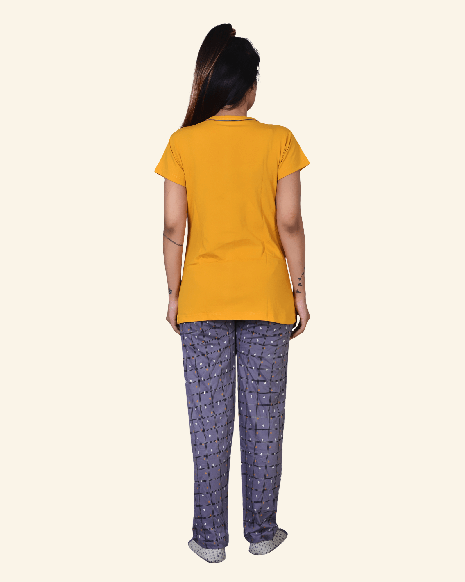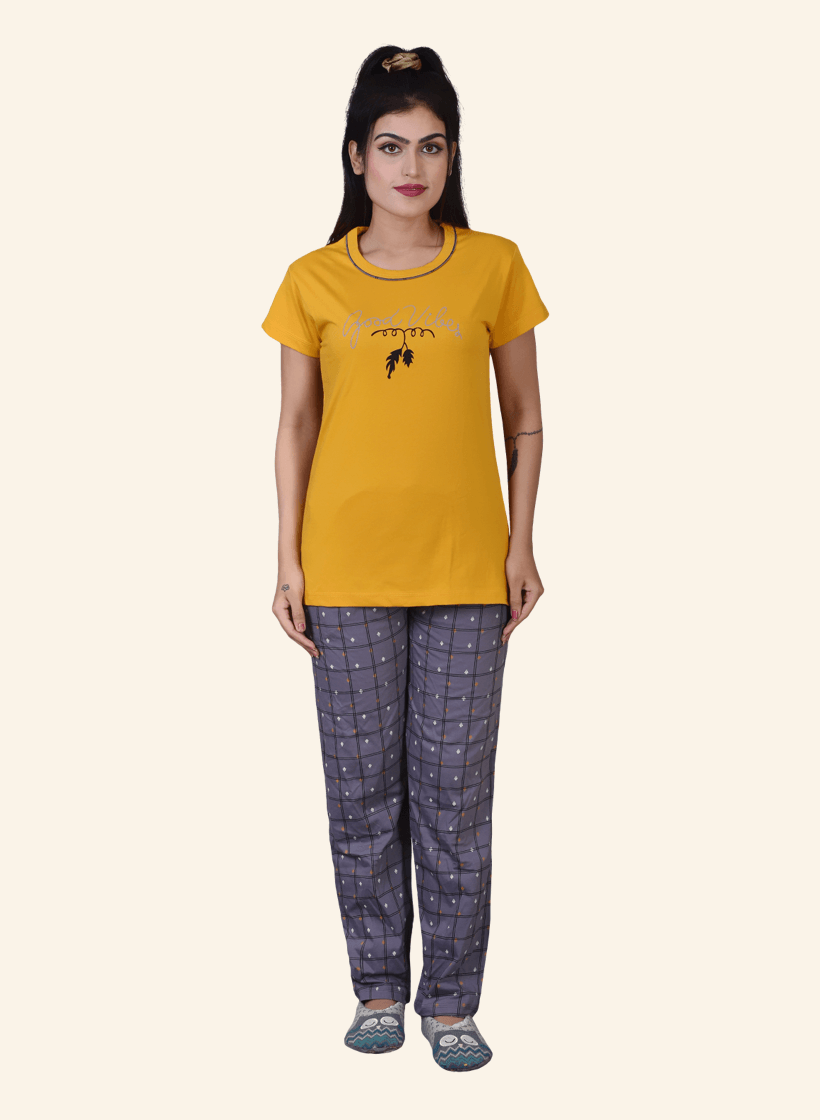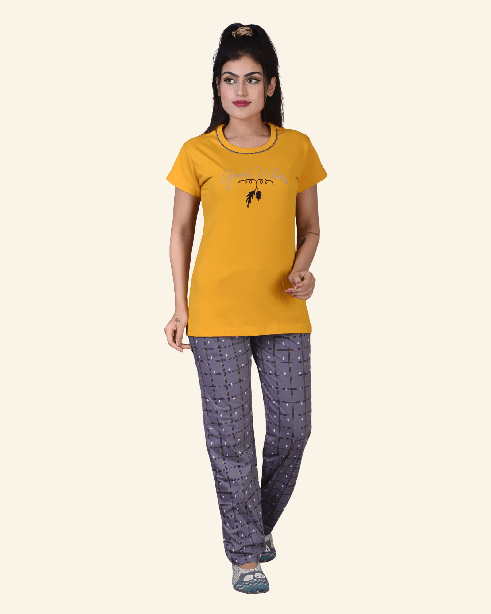 'Good Vibes' is a premium Pajama set that consists of a yellow top and grey pajama. The yellow color top has a round neck, short sleeves, contrast piping and a printed quote to make you look amazing.