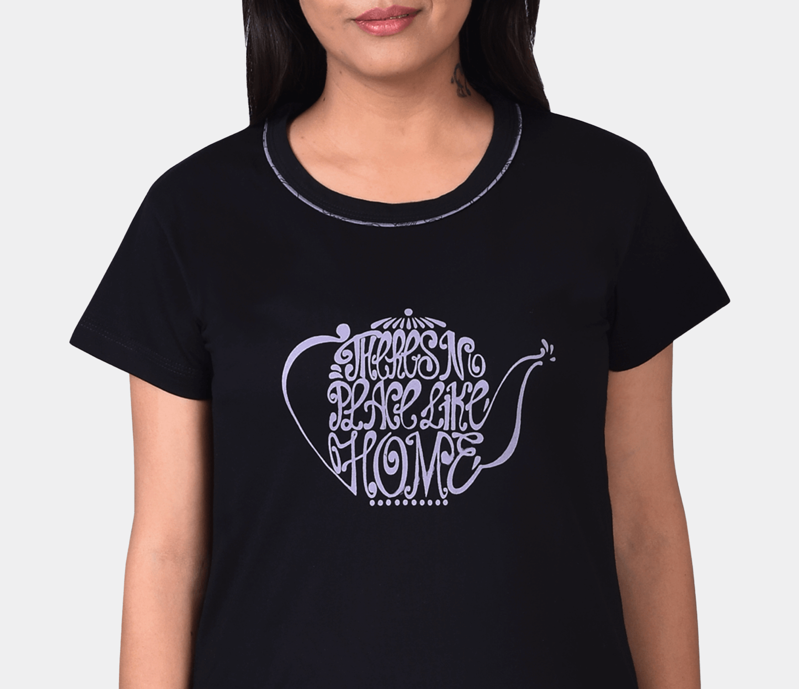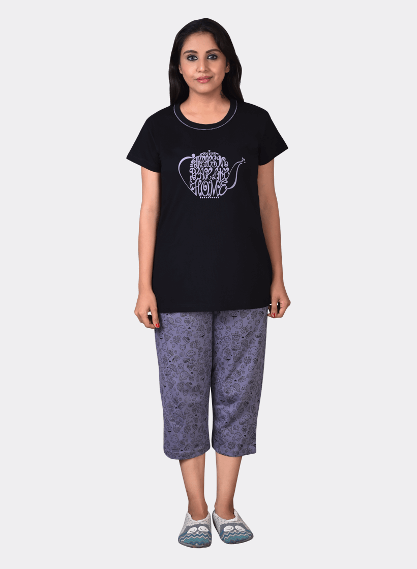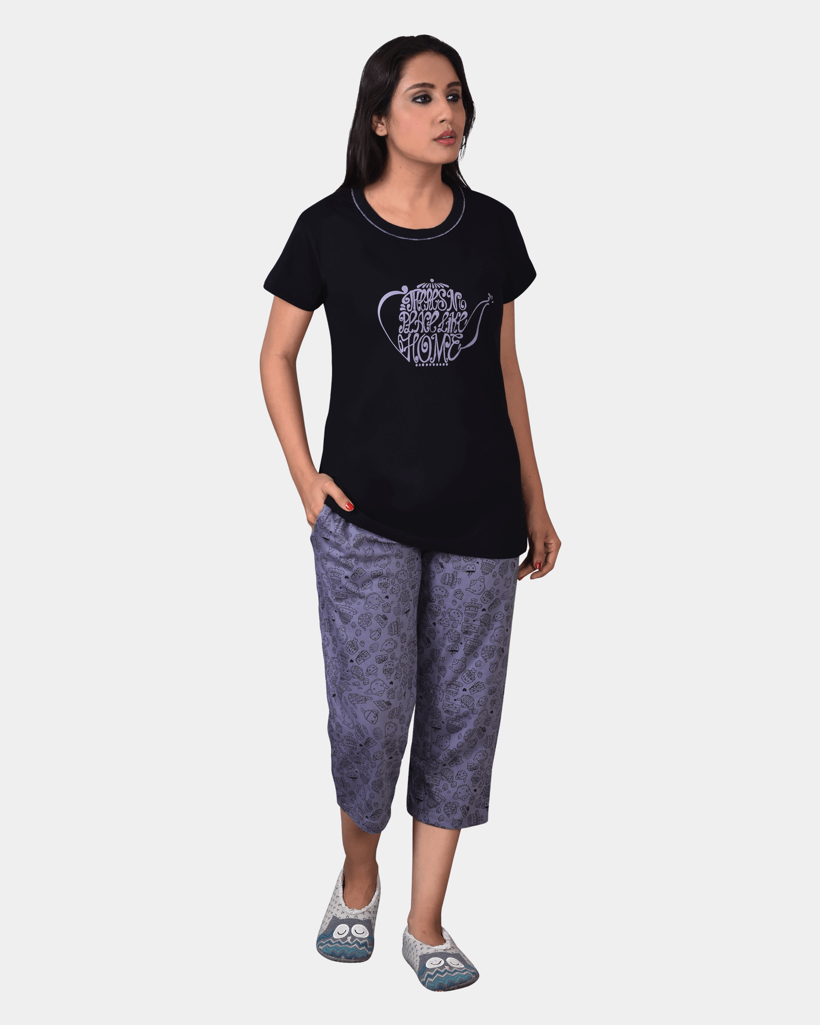 'Homely' is a premium Capri set that consists of a black top and grey Capri. The black color top has a round neck, short sleeves, contrast piping and a printed quote to make you look amazing.