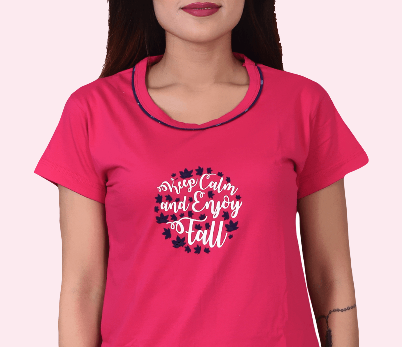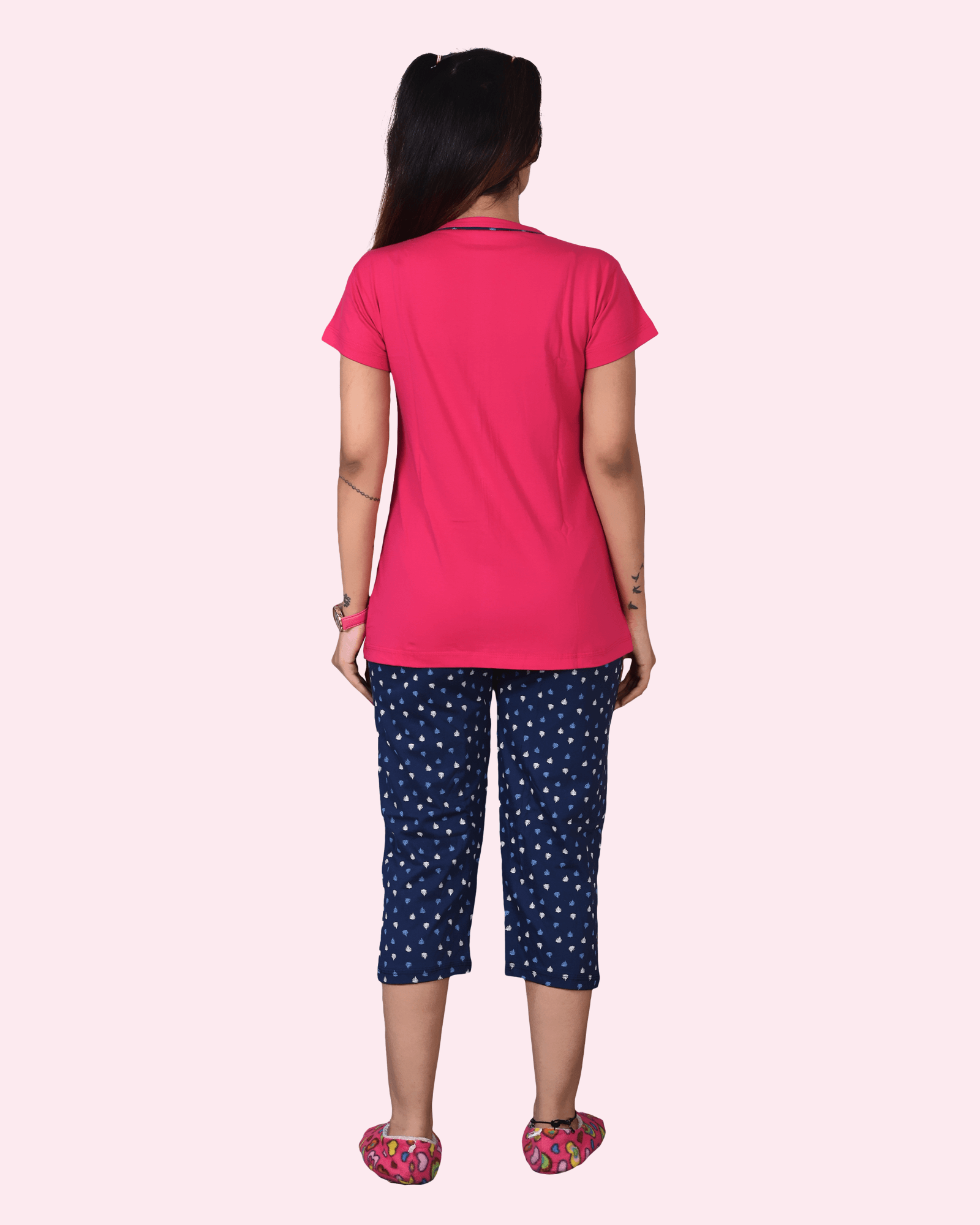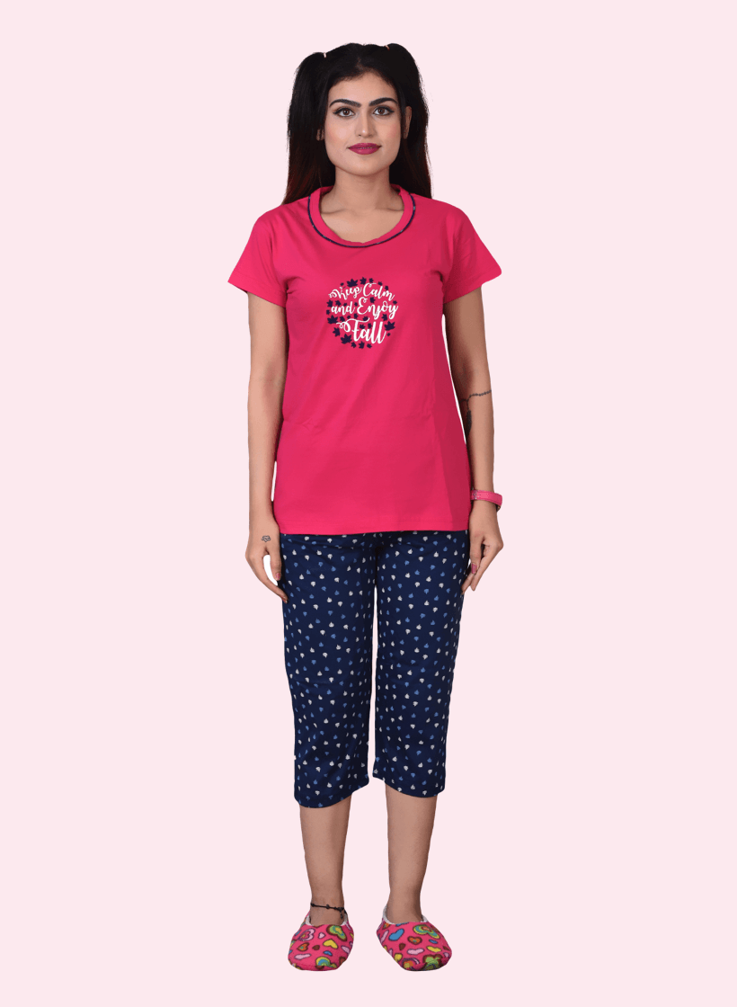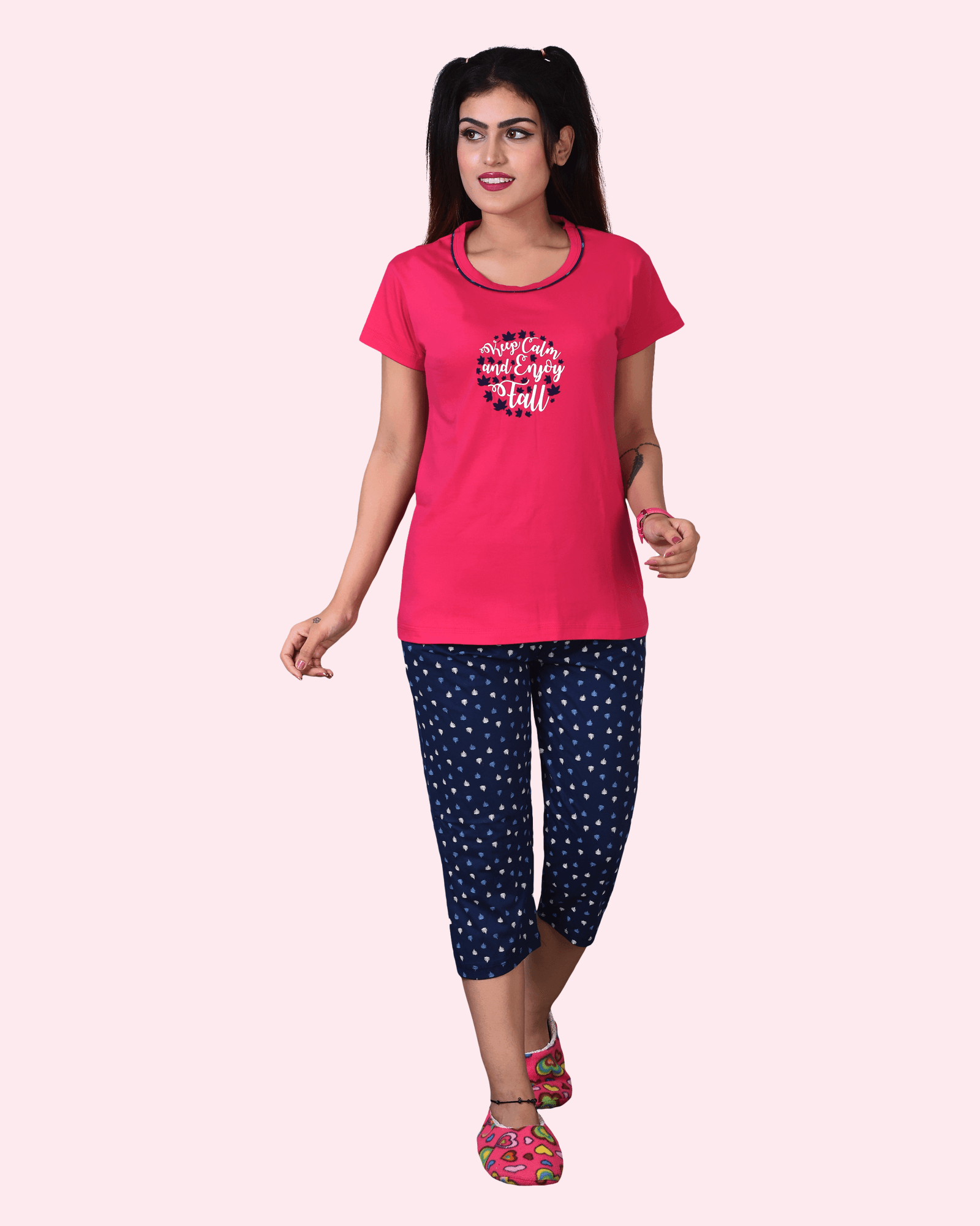 'Keep Calm' is a premium Capri set that consists of a pink top and blue Capri. The fresh pink color top has a round neck, short sleeves, contrast piping and a printed quote to make you look amazing.