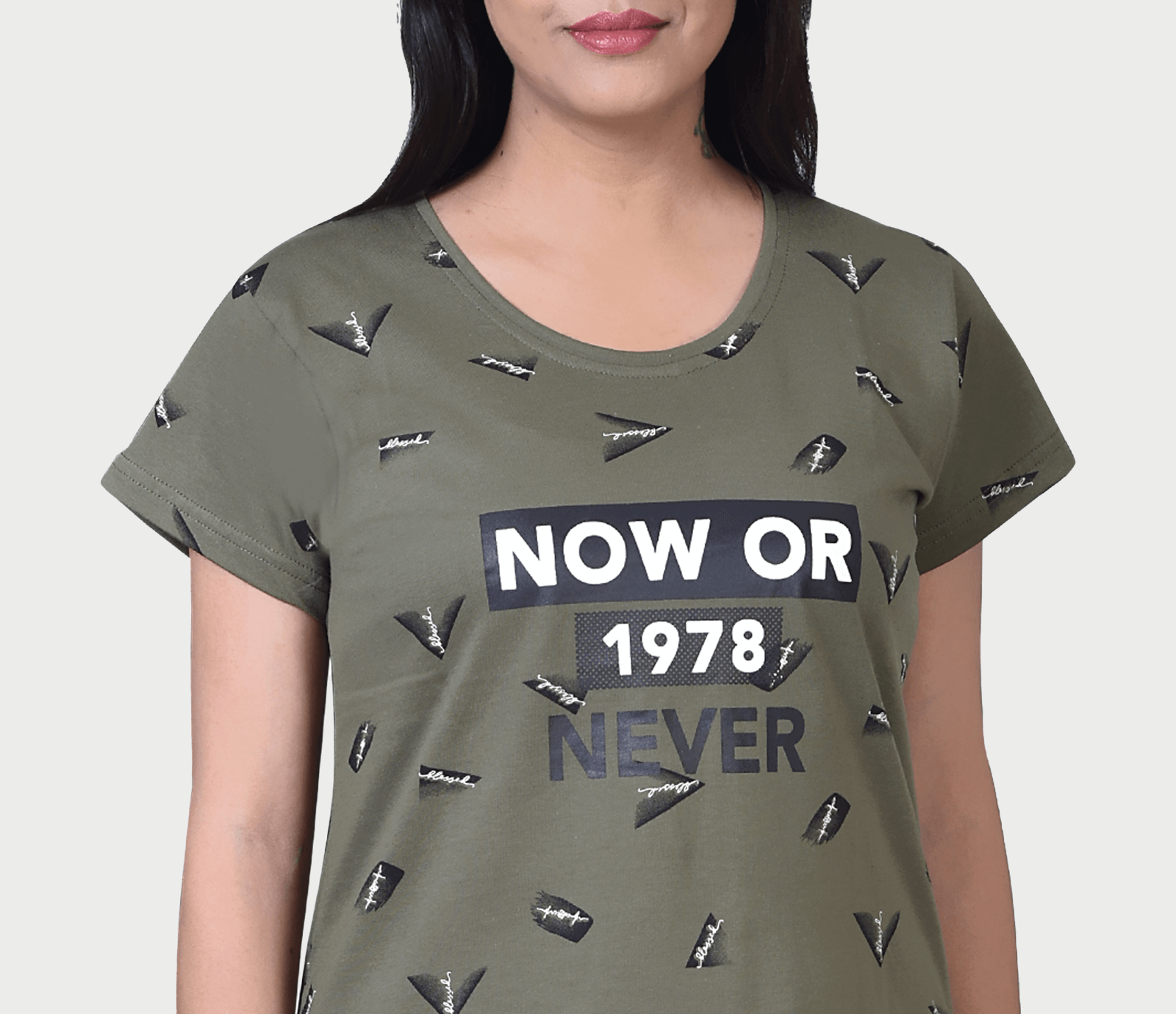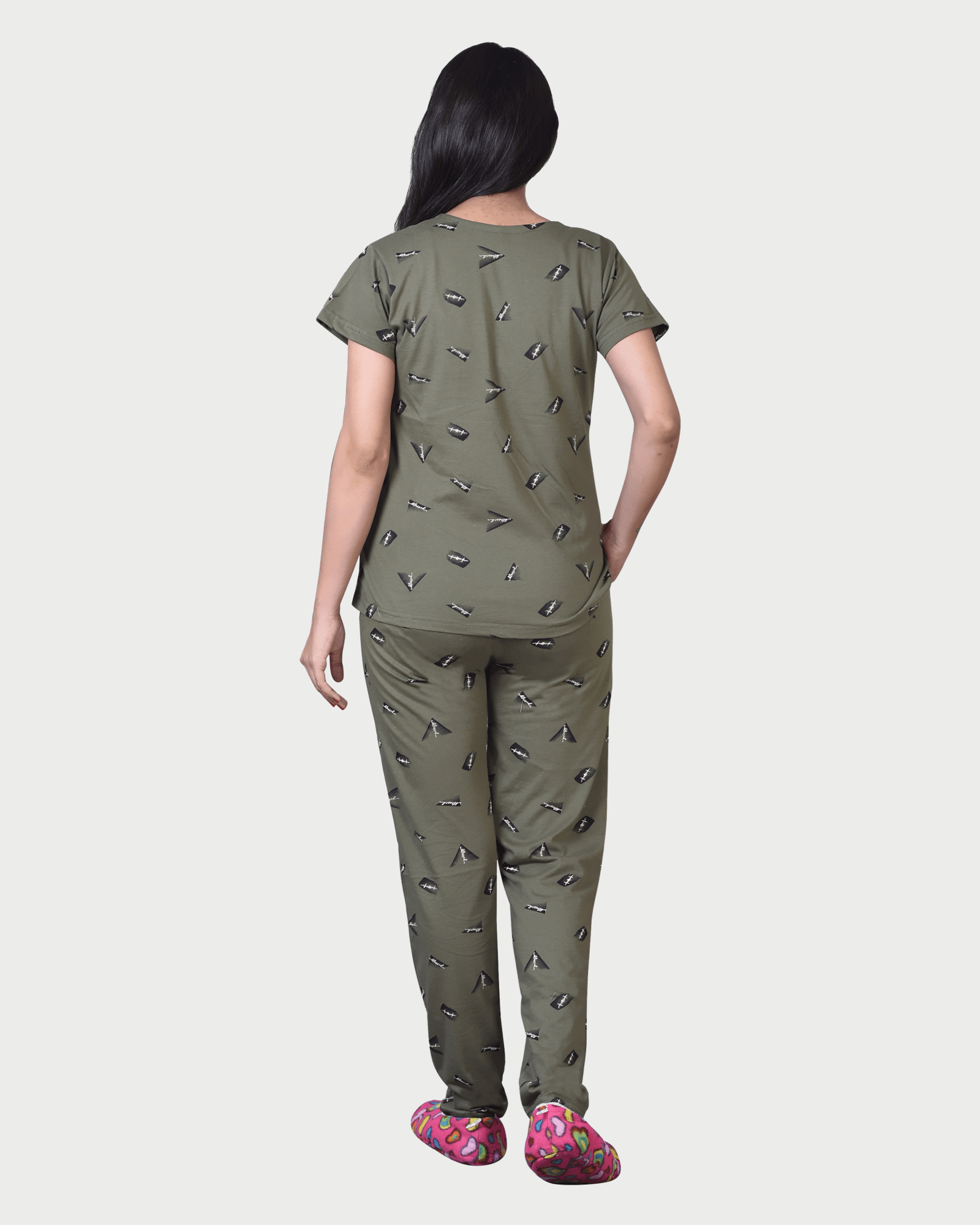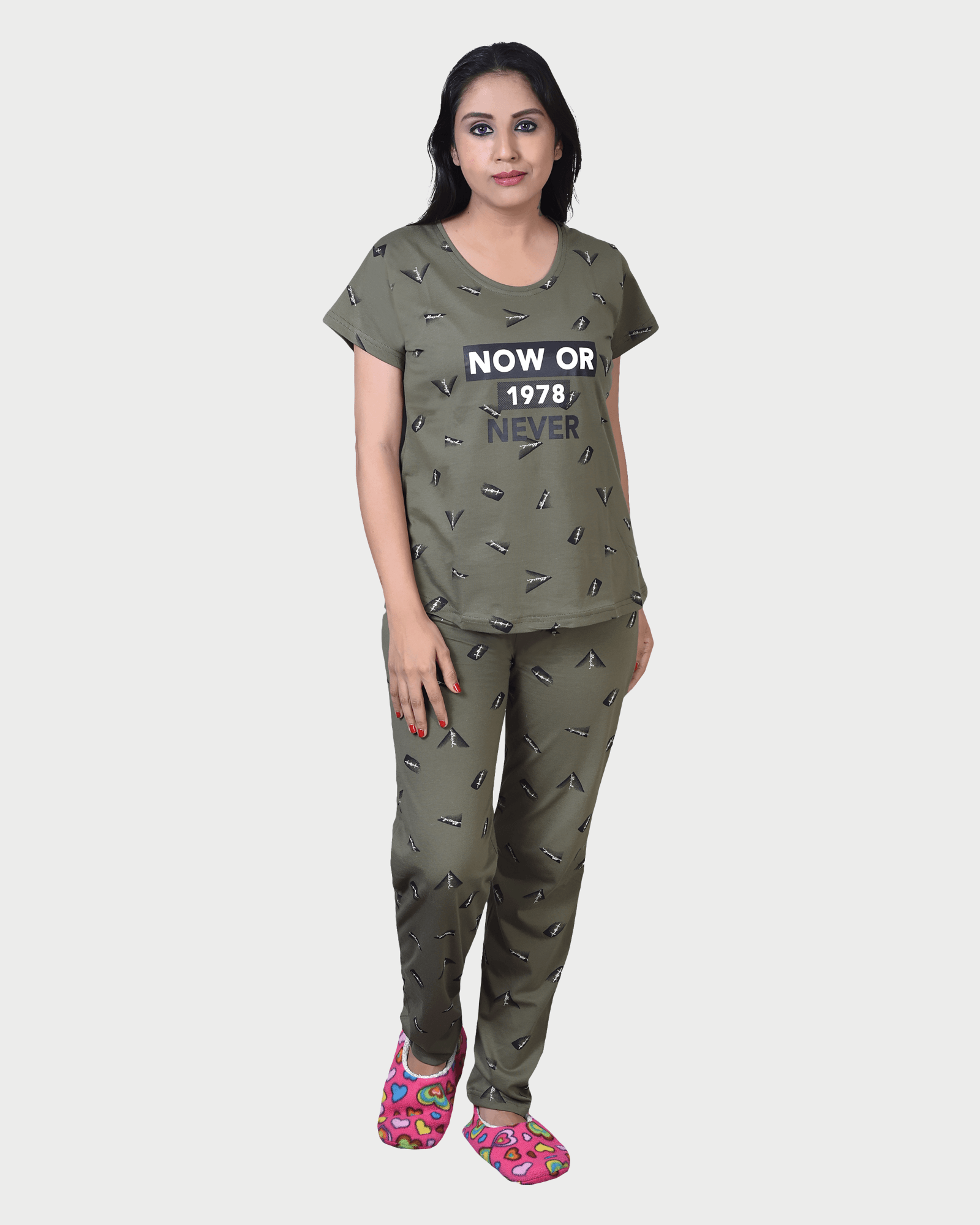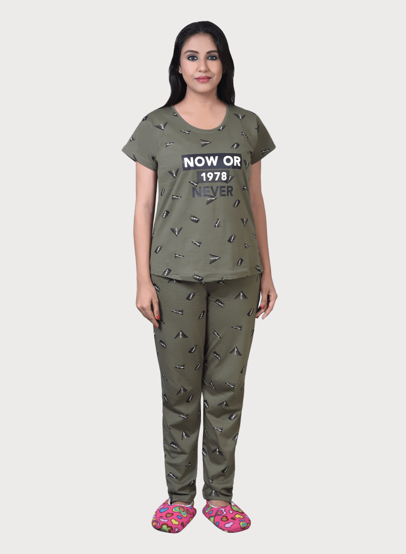 'Now or Never' is a premium cotton Pajama set that consists of a mehndi green top and mehndi green pajama with overall print. The mehndi green color top has a round neck, short sleeves and a printed quote to make you look amazing with an all-over print.