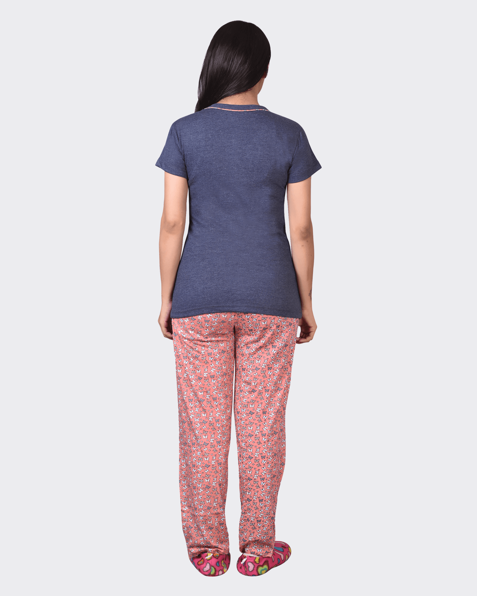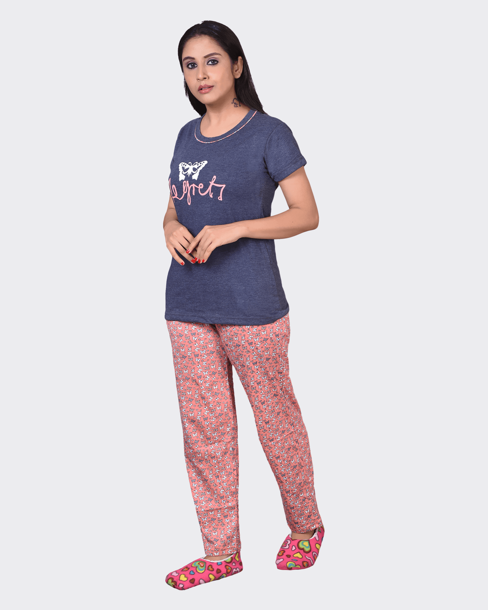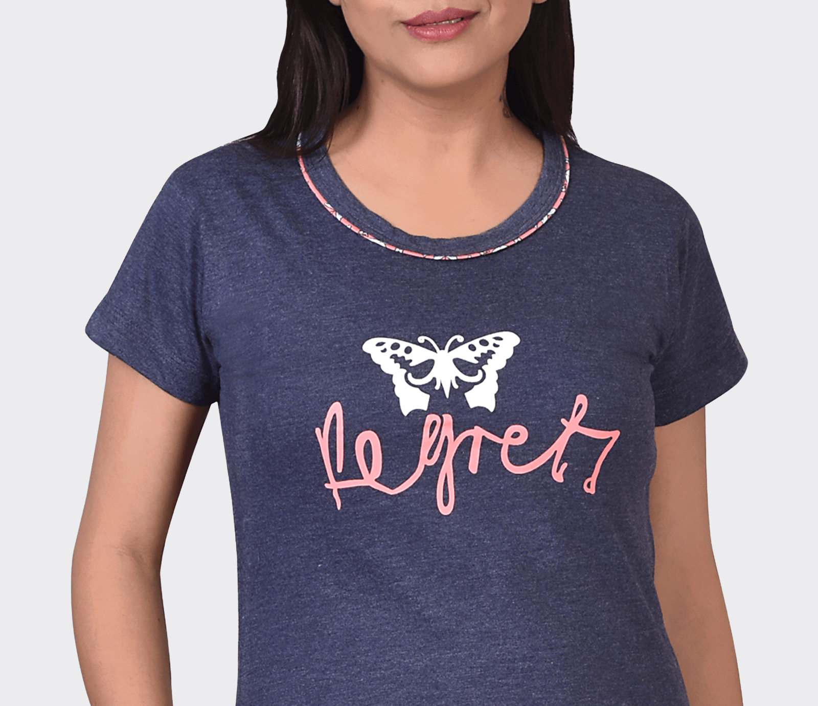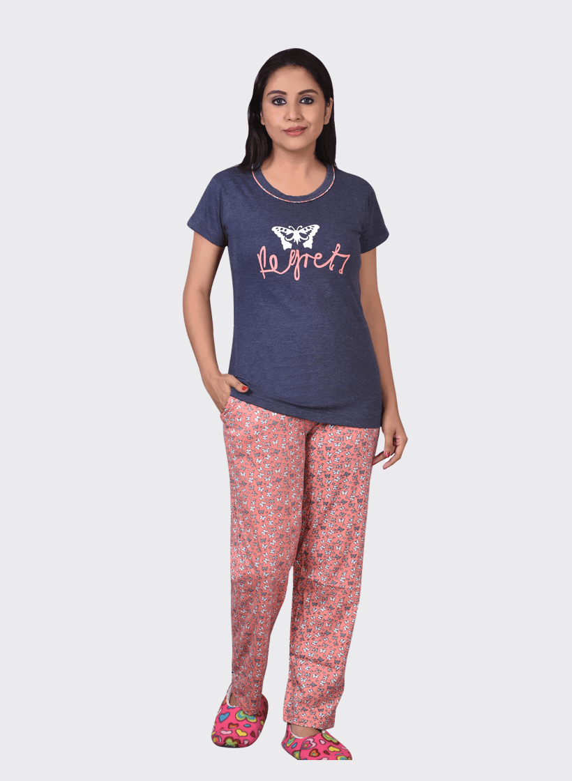 'No Regrets' is a premium Pajama set that consists of a blue top and light pink pajama. The blue color top has a round neck, short sleeves, contrast piping and a printed quote to make you look amazing.