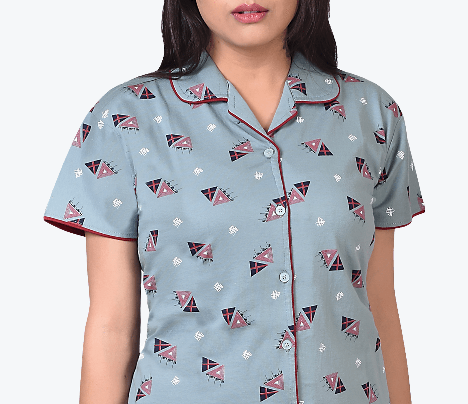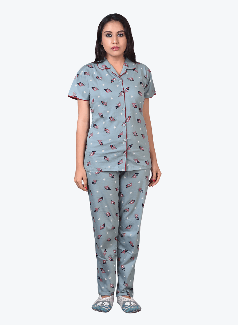 Teal Blue front open cotton PJ set with overall print consists of shirt and pajama. The printed shirt has a lapel collar, short sleeves and contrast piping. A pair of similar printed slip-on pyjamas have an elasticated waistband with one pocket. It is the perfect luxury cotton PJ set for indoors/outdoors.